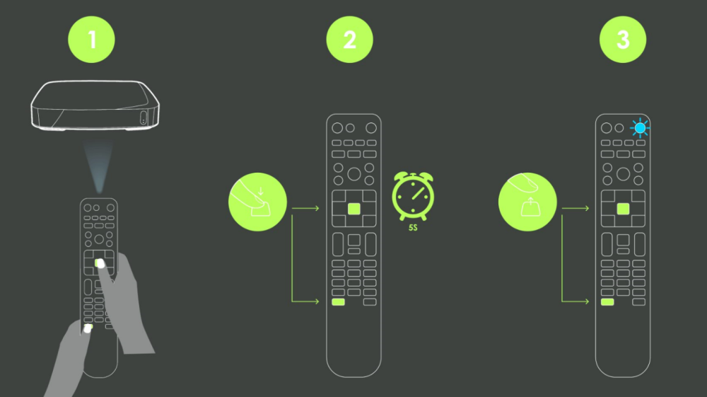 Achtung! Halten Sie die OPTION + OK Tasten gleichzeitig für rund 5 Sekunden gedrückt. Dann lassen Sie gleichzeitig beide Tasten los und auf der Fernbedienung wird rechts oben die STB-Power Taste 2x blinken und dann konstant leuchten.