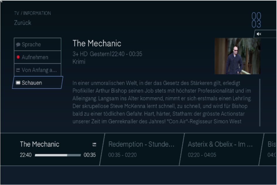 Nebst der Sprache können Sie einen Aufnahmebefehl absetzen oder diese Sendung von Anfang an Schauen (=Start-Over-Betrieb), Auch werden die EPG’s angezeigt.