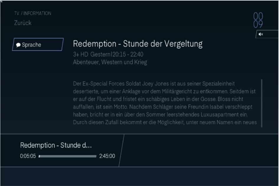 Bei einer bereits abgespielten Sendung im Replay-Betrieb können Sie mit der Info-Taste die Sprache auswählen und sich die EPG-Informationen anzeigen lassen.