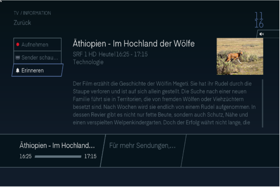 Bei einer zukünftigen Sendung im Vorschau-Betrieb können Sie mit der Info-Taste die Sendung aufnehmen, eine Erinnerung absezten oder sich die EPG-Informationen anzeigen lassen.