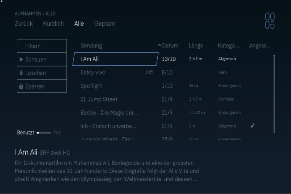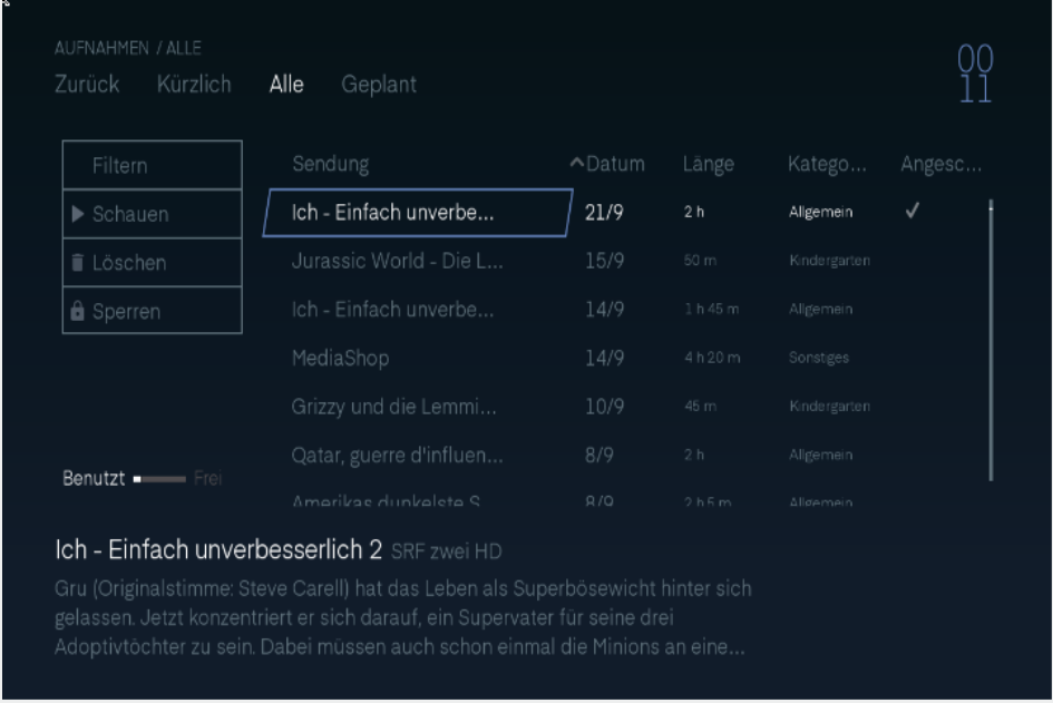 Mit der Nach-Unten-Taste können Sie weitere ältere Aufnahmen ansteuern. Neben der Beschreibung der Sendung, finden Sie das Ausstrahlungsdatum, Länge, Kategorie und ein Flag für angeschaute Programme.