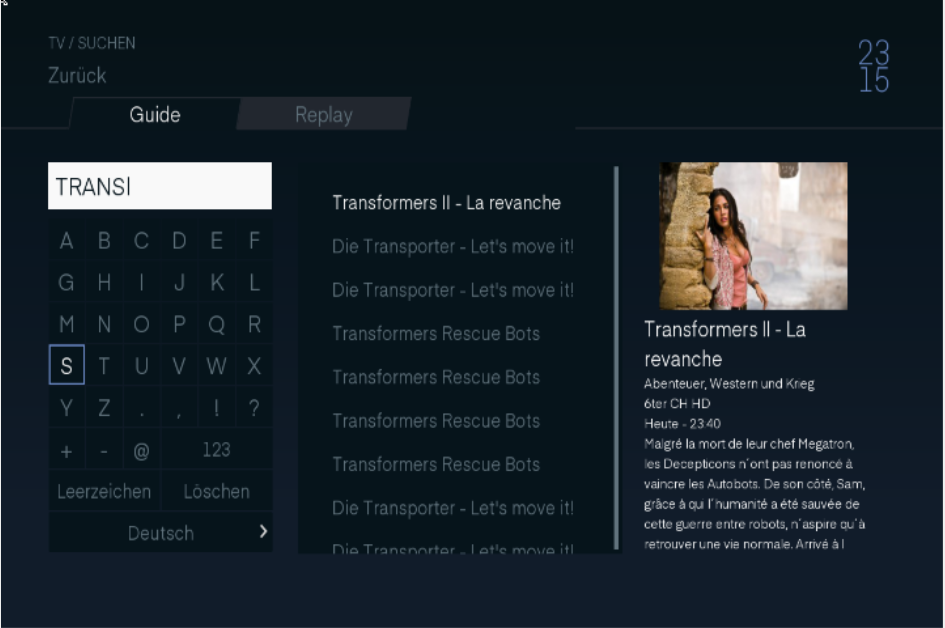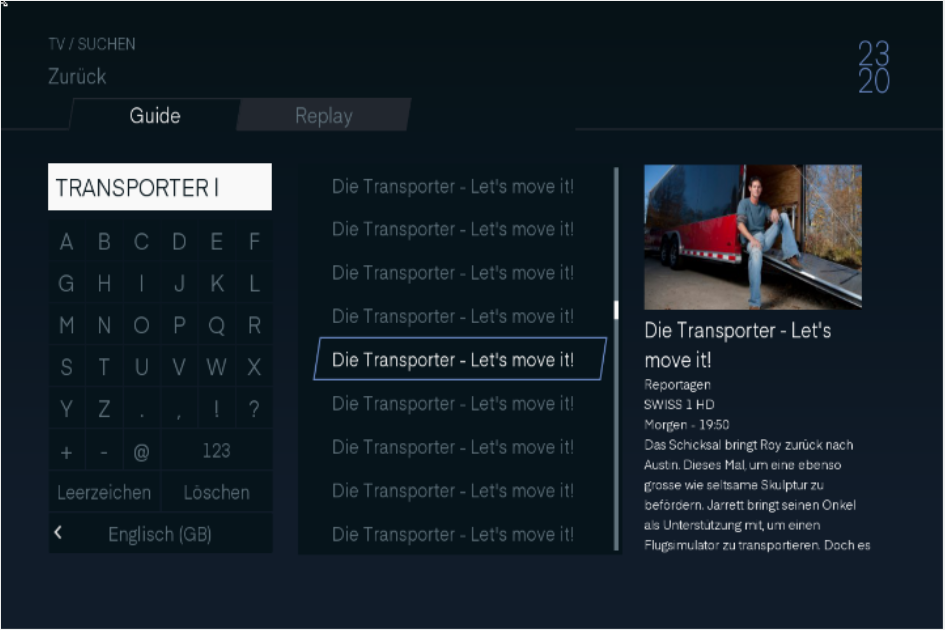 Wenn Sie Sendung im Replay-Betrieb aus dem Video-Archiv suchen wollen, dann müssen Sie den TAB Replay ansteuern. Jetzt wird das Suchergebnis auf abgespielte Sendungen eingeschränkt.
